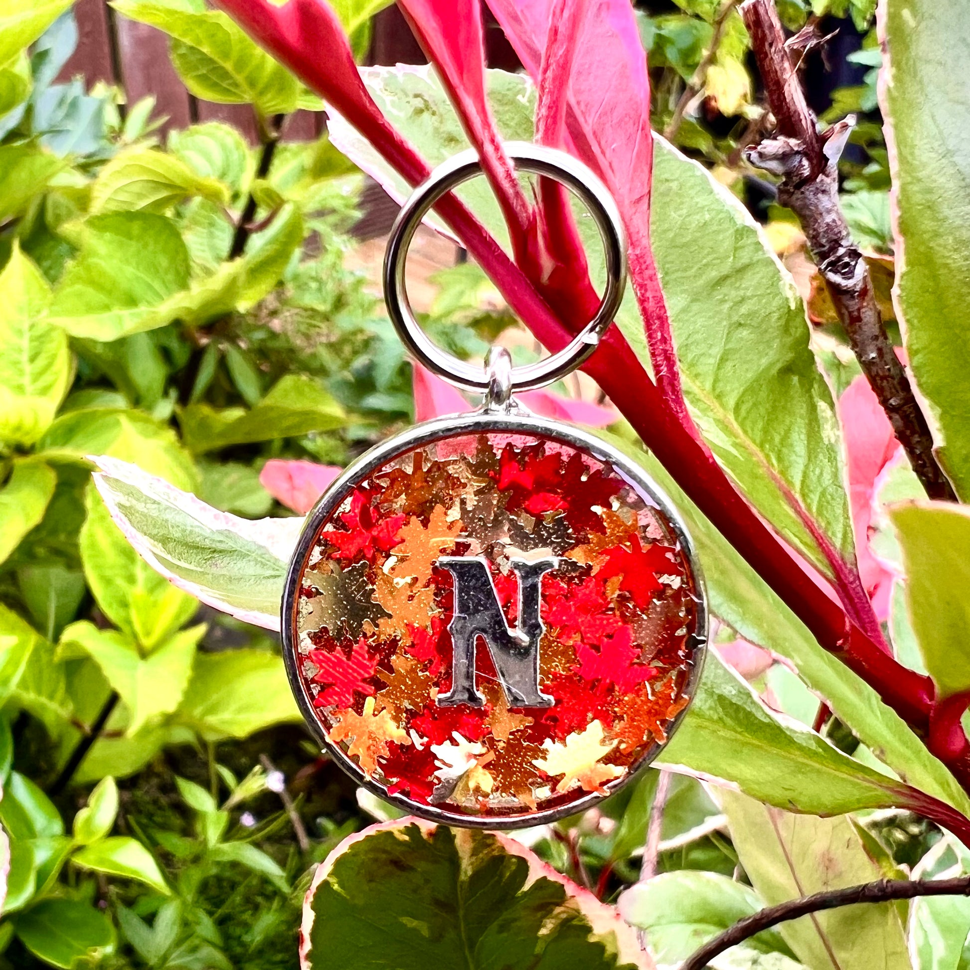 Captured in a round bezel with hardware available in silver or gold, this tag is filled with three tones of maple leaf pieces.